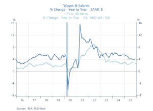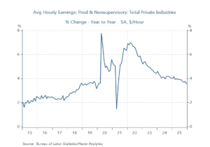 Amid slower gains in employment and average hourly earnings, the positive in labor markets is aggregate hours worked increased 0.7% in 2025. That’s fortunate insofar as wages and salaries and disposable personal income are driven by hours worked, not employment. Importantly, stronger productivity gains have powered the solid economic growth. During the year ending 2025Q3, productivity (private output/aggregate hours worked) in the nonfarm business sector rose 1.9% and 2.3% in the manufacturing sectors. This decided pickup in productivity reflects the continued momentum in business investment in data storage and related AI infrastructure plus production efficiencies stemming from broadening uses of AI innovations in both manufacturing and service-producing industries.