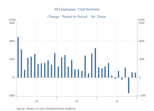 This deceleration in real wages and salaries reflects primarily a combination of moderating gains in average hourly earnings (AHE) and weakness in employment. As shown in Chart 2, AHE have moderated to 3.5% year-over-year growth from 4.1% a year earlier. The yr/yr rise in AHE will decline further in the January and February 2026 readings as the high monthly increases in Jan-Feb 2025 roll off. At the same time, establishment payroll gains have flattened significantly. In the six months July-December 2025, employment rose a net 87,000, an average of 14k per month; in the prior six months jobs rose 497k, an average monthly rise of 82k (Chart 3). In the prior year ending December 2024, employment rose over 2 million.
